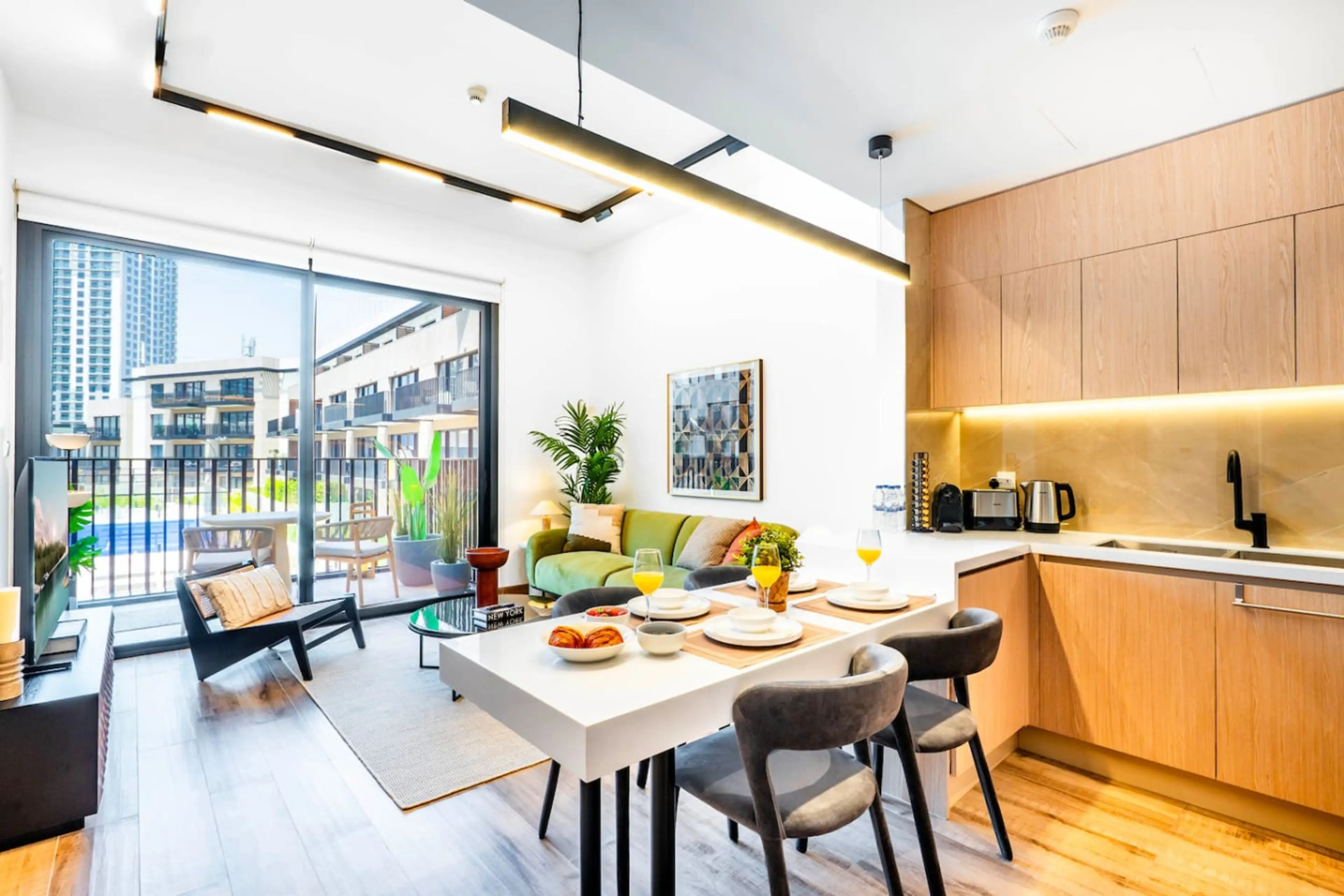 Welcome to our stylish 2-bedroom apartment in JVC, Dubai. Featuring modern décor and high-end finishes, it offers a spacious living area, a fully equipped kitchen, and a huge 120 sqft balcony with gorgeous pool views – an ideal spot for morning coffee or evening unwinding. Enjoy 5-star amenities, ...